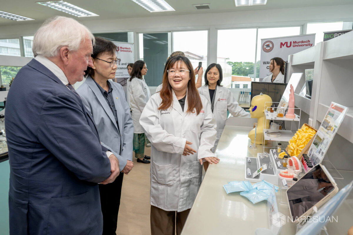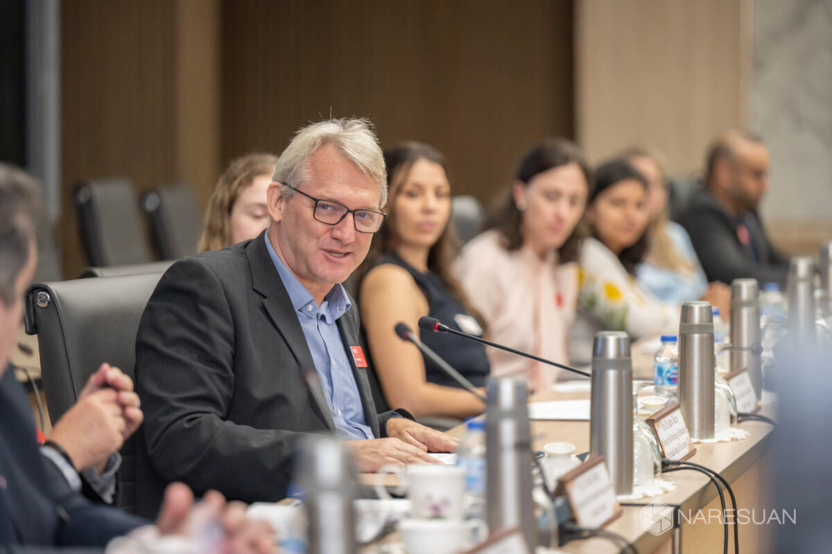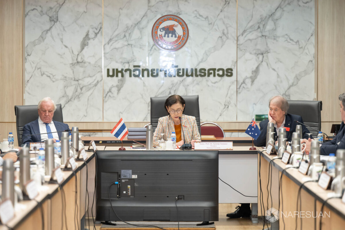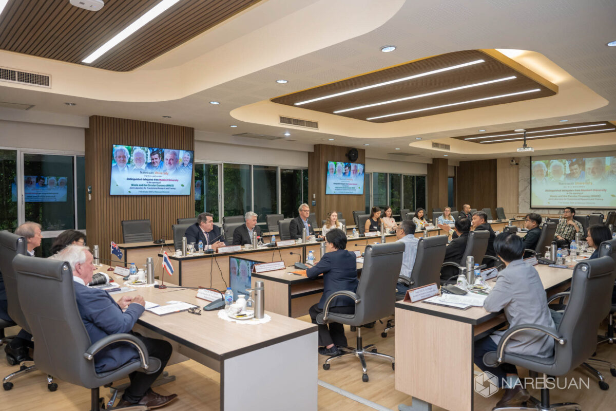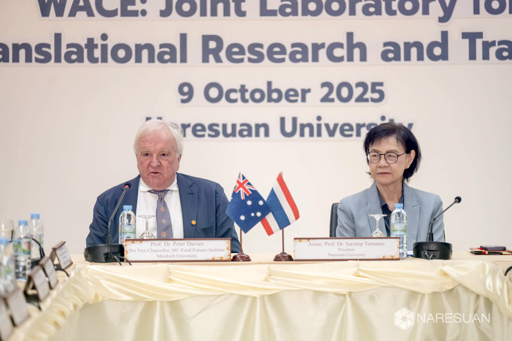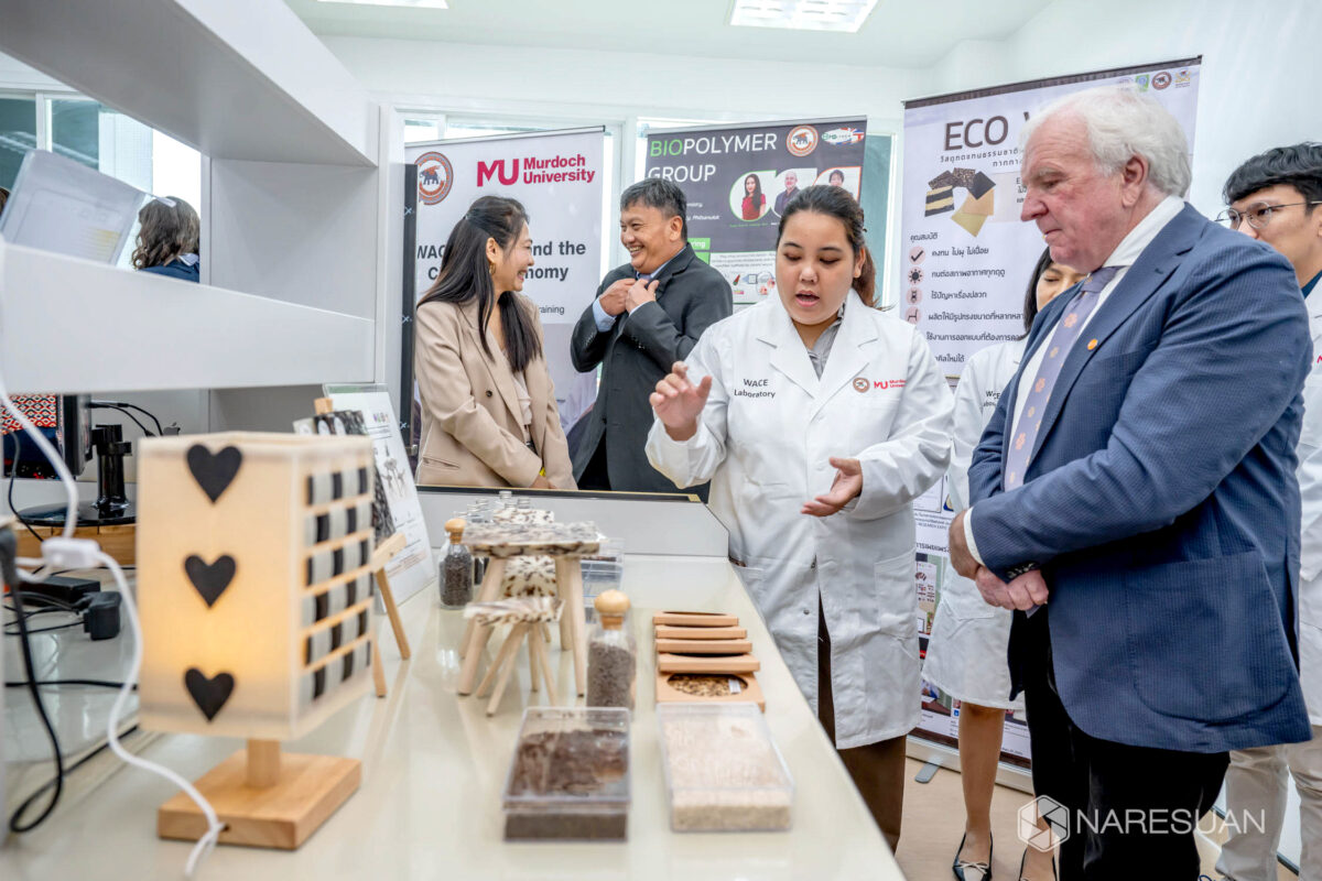 Presided over by Assoc. Prof. Dr. Sarintip Tantanee, President of Naresuan University (NU), a group of senior executives led by Prof. Dr. Peter Davies, Pro Vice Chancellor of Murdoch University (MU) and researchers from Bioplastics Innovation Hub from the same institution met with NU team members to discuss likely future of cooperation between the two universities on 8 October 2025. The focus of discussion was placed upon research collaboration in biopolymers, bioplastics and biological products to be contributed by the establishment of the Joint Laboratory of Waste and the Circular Economy (WACE), for which the details were jointly presented by NU and MU at Queen Sirikit National Convention Center on 1 October 2025. It is expected that the lab would encourage joint research activities, intellectual properties and patents benefiting not only NU and MU but the industry and spinoff companies who are looking for products and know-hows constituting waste and pollution free for the next generation. It is also noted that both the partners find out mutually agreed topics, research and products to push for joint publications while maintaining the mindset of reducing microplastic waste and other related harmful agents to save the environment. Having a Science Park located at Naresuan University, it is essential that they work closely with the private sector and nearby municipalities to come up with solutions for agricultural waste reduction where as WACE will play one of the key roles to serve as a portal for experienced researchers from Thailand and Australia, where funding is expectedly drawn from international funding agencies given increased visibility achieved by both NU and MU.